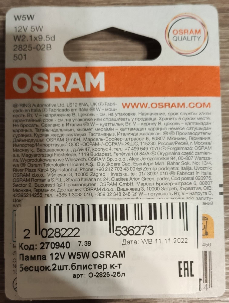 Отзывы Лампа 12Vx5W OSRAM бесцокольная 2 штуки блистер